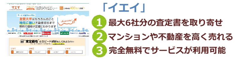 イエイ 不動産を高く早く賢く確実に売るために利用したい無料査定サービスです。大手不動産から地元に強い不動産に無料で見積が簡単に取れるサービスになります。 |